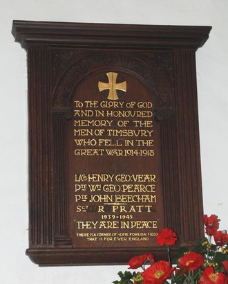 To the Glory of God and in honoured memory of the men of Timsbury who fell in the Great War 1914 - 1918 (Names) (Name) 1939-1945 They are in peace There is a corner of some foreign field that is forever England