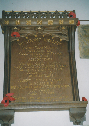 IN LOVING MEMORY / OF / WALTER DAVID HANCOX / NO 140053, R.E. / KILLED IN ACTION IN FRANCE / JULY 1ST 1916. / AGED 30 YEARS. / WILLIAM RUFUS HANCOX / NO. 1907 OXFORD & BUCKS LT INFTY. / KILLED IN ACTION IN FRANCE / AUGUST 14TH 1916. / AGED 20 YEARS. / ALBERT EDWARD HANCOX / NO 139675, R.E. / DIED IN BELGIUM OF WOUNDS RECEIVED IN ACTION / JULY 24TH 1917. / AGED 19 YEARS. / GREATER LOVE HATH NO MAN THAN THIS, / THAT A MAN LAY DOWN HIS LIFE FOR HIS FRIENDS.