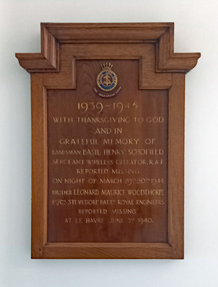 [bADGE] 1939 - 1945 / With Thanksgiving to God / and in / Grateful memomory of / Bandsman Basil Henry Schofield / Sergen t Wireless Operator, ar.a.f. /Reported Missing / on night of March 29th-30th 1944 / Brother Leonard Maurice Woodthorpe / Lce. Cpl. Stevedore Battn. Royal Engineers / Reported Missing / At Le Havre June 3rd, 1940