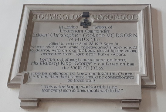 [In relief]: TO THE GLORY OF GOD / [incised]: In Loving Memory of / Lieutenant Commander / Edgar Christopher Cookson. V.C. D.S.O, R.N. / of H.M.S. Clio. / Killed in action Sept. 28. 1915 Aged 31. / He was shot down while endeavouring single handed / to destroy with an axe the boom placed by the enemy / across the river Tigris near Kut-el-Amara. / For this act of most conspicuous gallantry / His Majesty King George V conferred on him / the Victoria Cross. / From his childhood he knew and loved this Church: / it is fitting then that his name should be commemorated / on these walls. / "This is the happy warrior: this is he / that every man in arms should wish to be."