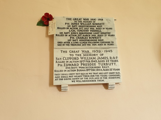 (First World War0 PTE. JAMES WILLIAM BOWKETT 1ST. BATT. HEREFORDSHIRE REGT. KILLED IN ACTION 21ST JULY 1916, AGED 19 YEARS L/CPL. TIMOTHY VERNALL 1ST. BATT. KING'S SHROPSHIRE LIGHT INFANTRY KILLED IN ACTION 21ST MARCH 1918, AGED 27 YEARS PTE. CHARLES BOWKETT 1ST BATT. HEREFORDSHIRE REGT. DIED AFTER A LONG ILLNESS FOLLOWING EXPOSURE TO GAS IN THE TRENCHES 24TH FEB. 1929, AGED 35 YEARS. (Second World War) SGT. CLIFFORD WILLIAM JAMES, R.A.F. KILLED IN ACTION 19TH FEB. 1943, AGED 22 YEARS PTE. EDWARD PRESDEE TURBUTT, 2ND. BATT. WORCESTERSHIRE REGT. KILLED IN ACTION BURMA 19TH DEC. 1944, AGED 22 YEARS