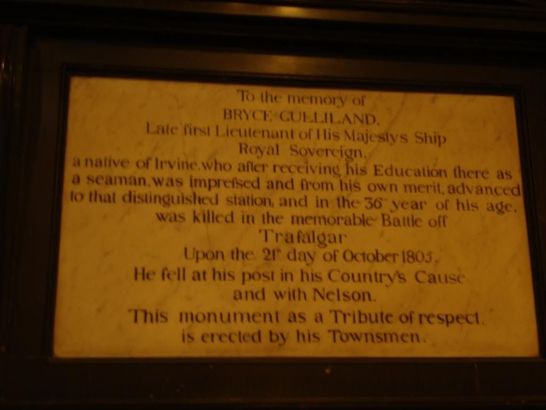 To the memory of/BRYCE GULLILAND/Late First Lieutenant of His Majesty's Ship/Royal Sovereign/a native of Irvine who after receiving his education there as/a seaman was impressed and from his own merit advanced/to that distinguished station, and in the 36th year of his age,/was killed in the memorable Battle of/Trafalgar/Upon the 21st day of October 1805./He fell at his post in his Country's Cause/and with Nelson./This monument as a Tribute of respect/is erected by his Townsmen