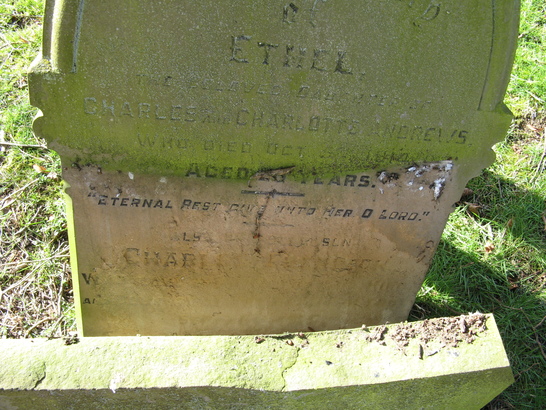 In / Loving Memory / Of / Ethel / The Beloved Daughter Of / Charles & Charlotte Andrews / Who Died Oct. 5th 1914 / Aged 25 Years “Eternal Rest Give Unto Her O Lord” (Line Unreadable) / Charles Frederick/ (Line Unreadable) / (Line Unreadable) / Aged (?) [Note: Previous survey of cemetery has recorded Charles Frederick Andrew as son of Charles and Charlotte Andrew. Died at Battle of Loos 26th Sep 1915, aged 23 years] Surname Andrews incorrect on stone and should read Andrew. Charles Frederick Andrew on 1892 birth record, census and CWG