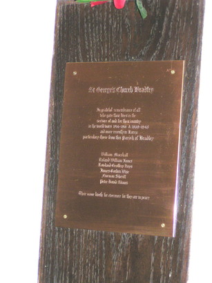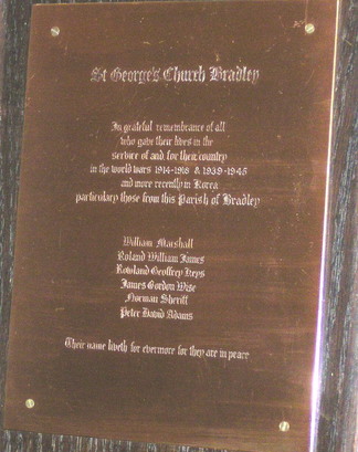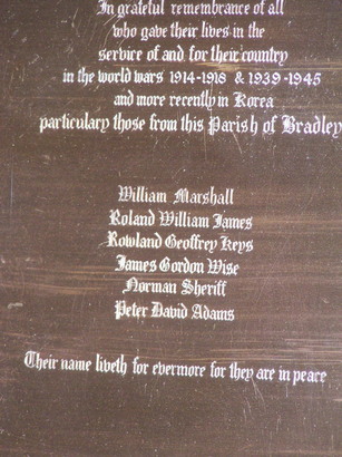 St George’s Church, Bradley In grateful remembrance of all who gave their lives in the service of and for their country in the world wars 1914-1918 & 1939-1945 and more recently in Korea, particularly those from this parish of Bradley. William Marshall Roland William James Rowland Geoffrey Keys James Gordon Wise Norman Sherriff Peter David Adams Their names liveth for evermore for they are in peace.