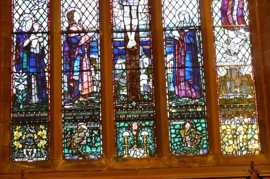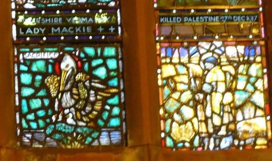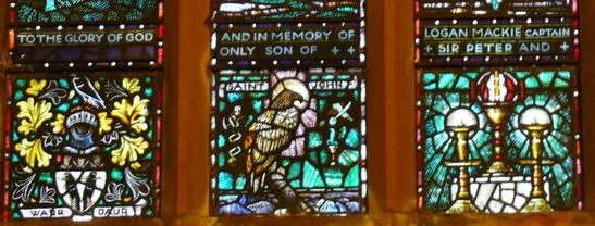 Light 1-TO THE GLORY OF GOD; Light 2-AND IN MEMORY OF/ONLY SON OF; Light 3-LOGAN MACKIE CAPTAIN/SIR PETER AND; Light 4-AYRSHIRE YEOMANRY/LADY MACKIE; Light 5-KILLED PALESTINE 27TH DEC 1917