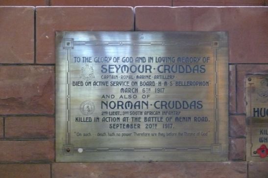 TO THE GLORY OF GOD AND IN LOVING MEMORY OF/SEYMOUR CRUDDAS/CAPTAIN ROYAL MARINE ARTILLERY/KILLED ON ACTIVE SERVICE ON BOARD H.M.S. BELLEROPHON/MARCH 6TH 1917/AND ALSO OF/NORMAN CRUDDAS/2ND LIEUT. 3RD SOUTH AFRICAN ARTILLERY/KILLED IN ACTION AT THE BATTLE OF MENIN ROAD./SEPTEMBER 20TH 1917/"On such...death hath no power. Therefore are they before the Throne of God"