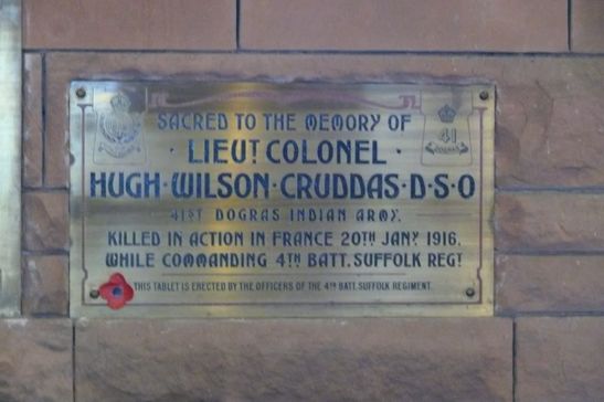 SACRED TO THE MEMORY OF/LIEUT COLONEL/HUGH WILSON CRUDDAS DSO/41ST DOGRAS INDIAN ARMY/KILLED IN ACTION IN FRANCE 20TH JANY 1916,/WHILE COMMANDING 4TH BATT. SUFFOLK REGT./THIS TABLET IS ERECTED BY THE OFFICERS OF THE 4TH BATT. SUFFOLK REGIMENT