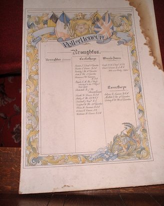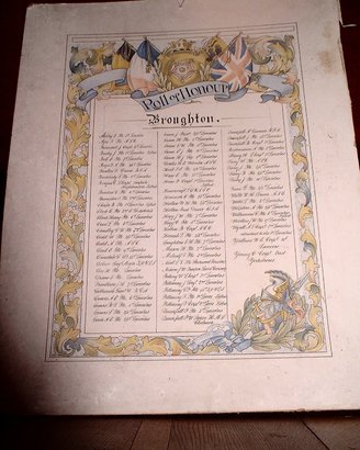 Illuminated roll of honour of those who served, from Broughton, and the hamlets of Castlethorpe, Wressle and Raventhorpe, on two sheets of parchment framed and glazed, names, initials, rank & regiment in black manuscript. ,