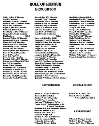 Broughton Ashley E. Pte. 5th Lincolns Green J. Pte. 2/5th Lincolns Quickfall A. Gunner R.F.A. Ayre F. Pte. A.S.C. Green H. Pte. 5th Lincolns Quickfall J. Pte. 1/5th Lincolns Bernard J. Capt. 6th Lincolns Green G.W. Pte. 5th Lincolns Quickfall R. Corpl. 1st Lincolns Barley J. Pte. 1st Lincolns. Killed Green E.J. Pte. 10th Lincolns Richardson A. Pte. 5th Lincolns Bell E. Pte. 7th Lincolns Green H.J. Sig. 5th Lincolns Strong H. L.Corpl. 1st Lincolns Boyall E. Pte. 2/5th Lincolns Goates H.E. Wheeler. A.S.C. Tacey W. Pte. A.S.C. Bratton F. Driver R.F.A. Hall F.E. Pte. 2/5th Lincolns Tacey J. Pte. 2/5th Lincolns Brocklesby G. Pte. 8th Lincolns Hare E. Pte. 1/5th Lincolns Tacey R. Pte. 2/5th Lincolns Burgess G. L.Corpl. Seaforth Highlanders. Killed Hare F. Corpl. 1st Lincolns. Killed Tutty J. Pte. 10th Lincolns Tune G. Pte. 2/5TH Lincolns Burdass W. Pte. 10th Lincolns Havercroft T.D. Pte. A.S.C. Wells W.H. Driver A.N.C. Brumpton T. Pte. 2nd Lincolns Howarth C. Pte. 1/5th Lincolns Wells L. Pte. 6th Lincolns Chafer R. Pte. 1st Lincolns. Hollin W.H. Pte. 2/5th Lincolns Welpton A. Pte. 6th Lincolns Clark C. Pte. 3rd E. Yorkshire Hollin Fred. Driver. R.F.A. Wilkinson G. Pte. 6th Lincolns. Killed Clark Harry Pte. 6th Lincolns Hogg J.W. Pte. 7th Lincolns Cross L. Pte. 6th Lincolns Hogg C. Pte. 5th Lincolns Woolas J.W. Pte. 9th Lincolns Chundley G.W. Pte. 3rd Lincolns Hollin B. Corpl. A.C.C. Wyatt A.T. Capt. 3rd Lincolns attached to the 1st Lincolns Codd W. Pte. 2/5th Lincolns Horrah T. Pte. 2/5th Lincolns Codd A. Pte. A.S.C. Laughton G.H. Pye. 7th Lincolns Watkins W.E. Capr. 15th Lancers Dent E.Pte. 9th Lincolns Mason H. Pte. 7th Lincolns Young C. Corpl. East Yorkshires Dinsdale G. Dvr. 1/5th Lincolns Metcalf T. Pte. 3rd Lincolns Dobson Sergt. Major K.O.Y.L.I. Neal L.V. Pte. Sherwood Foresters Day H. Pte. Lincolns Nixon J.W. Trooper. Lincs Yeomany Drane G. Pte. Lincolns Paling W. L.Corpl. 3rd Lincolns Fanthorpe J.H. 7th Lincolns Pittaway J. Sergt. 2nd Lincolns Gathercole W. Gunr. R.G.A. Pittaway G.P. Pte. 1/5th K.O.Y.L.I. Graves A.E. Pte. 6th Lincolns Pittaway F. Pte. 1st Lincolns. Killed Graves R.T. Pte. 5th Lincolns Pittaway T. Cprpl. 2nd Lincolns Killed Graves S. Pte. 2/5th Lincolns Quickfall F. Pte. 5th Lincolns Green A.E. Pte. 2/5th Lincolns Quickfall P.W. Stoker. H.M.S. Chelmer