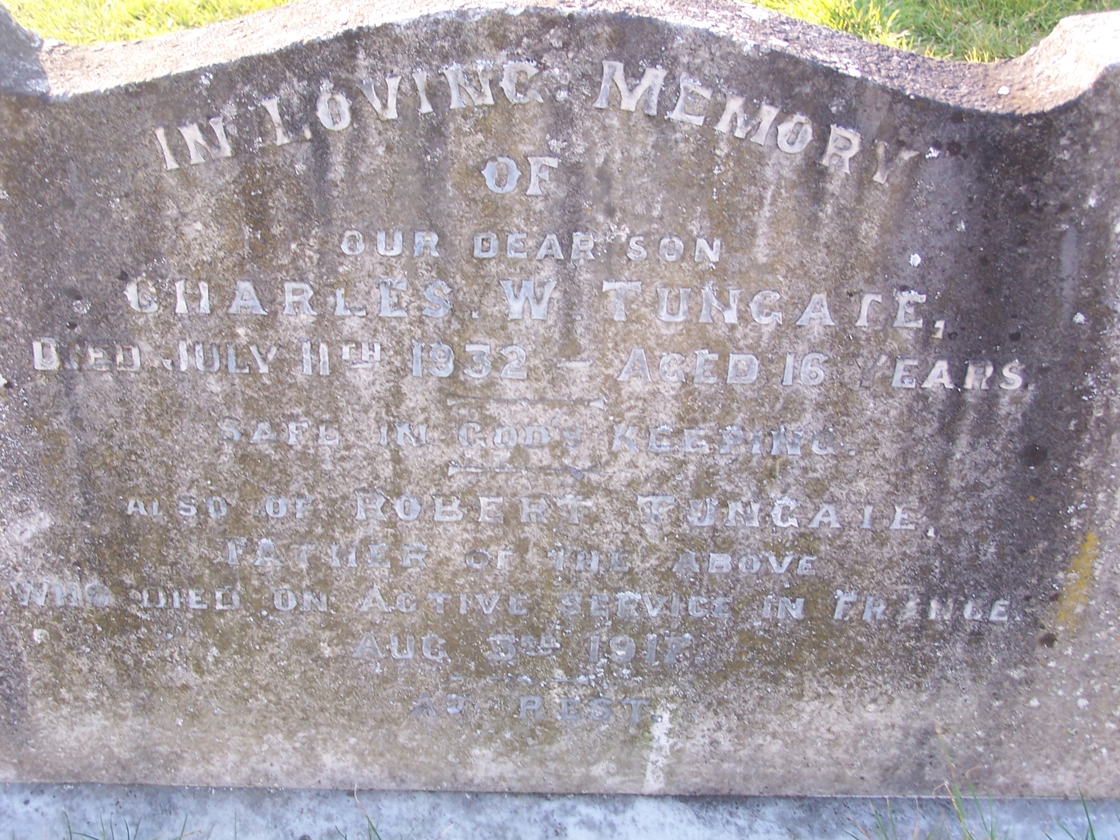 In Loving Memory / Of / Our Dear Son / Charles W Tungate / Died July 11th 1932 – Aged 16 Years Safe In Gods Keeping / Also Of Robert Tungate / Father Of The Above / Who Died On Active Service In France / Aug 3rd 1917 / At Rest.