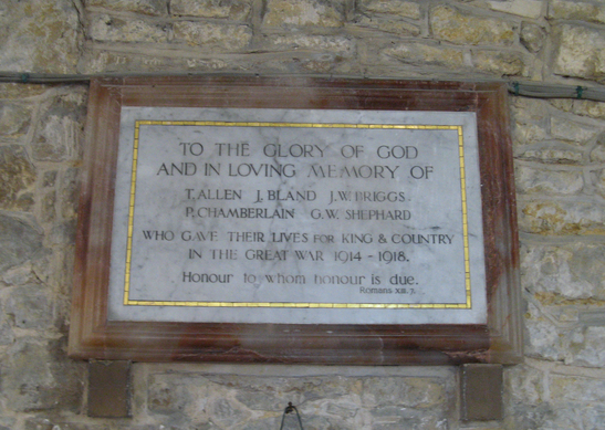 "To the Glory of God and in living memory of (here follows 5 names) who gave their lives for King and County in the Great War 1914 – 1918" "Honour to whom honour is due" Romans XIII 7