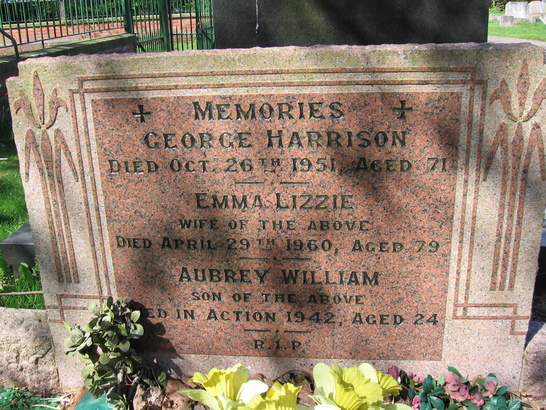 Headstone -Memories/ George Harrison/ Died Oct. 26th 1951, Aged 71/ Emma Lizzie/ Wife Of The Above/ Died April 29th 1960, Aged 79/ Aubrey William/ Son Of The Above/ Died In Action 1942, Aged 24./ R.I.P. Tablet: E. H. Harrison / Died 22nd Feb. 1960 / Aged 50 / R.I.P.