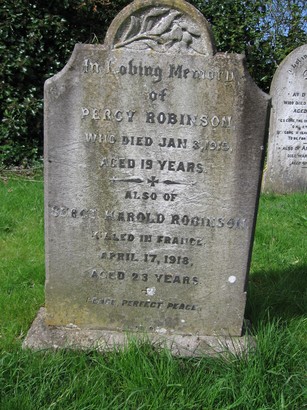 In loving memory/ of/ Percy Robinson,/ Who Died Jan. 3, 1913,/ Aged 19 Years./ Also Of/ Sergt Harold Robinson,/ Killed In France,/ April 17, 1918,/ Aged 23 Years./ Peace, Perfect Peace