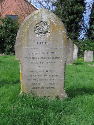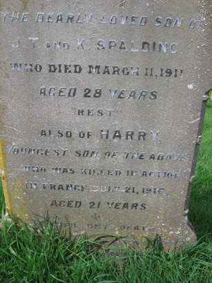 In Loving Memory of/ Sidney/ The Dearly Loved Son Of/ J.T And K Spalding./ Who Died March 11, 1911,/ Aged 28 Years/ “Rest”/ Also Of Harry,/ Youngest Son Of The Above/ Who Was Killed In Action/ In France July 21, 1916,/ Aged 21 Years/ Faithful Unto Death/ (Unknown line).
