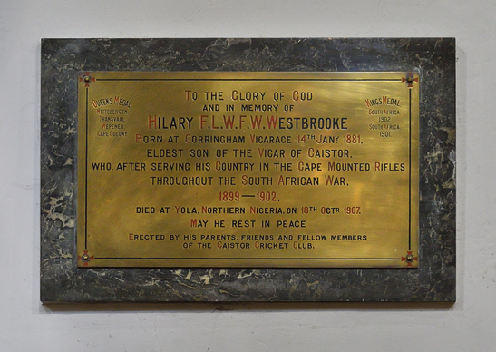 QUEEN'S MEDAL./ WITTEBERGEN./ TRANSVAAL./ WEPENER./ CAPE COLONY./ TO THE GLORY OF GOD/ AND IN MEMORY OF/ HILARY F.L.W.F.W. WESTBROOKE/ BORN AT CORRINGHAM VICARAGE 14TH JANY 1881,/ ELDEST SON OF THE VICAR OF CAISTOR,/ WHO, AFTER SERVING HIS COUNTRY IN THE CAPE MOUNTED RIFLES/ THROUGHOUT THE SOUTH AFRICAN WAR,/ 1899─1902,/ DIED AT YOLA, NORTHERN NIGERIA, ON 18TH OCTR 1907./ MAY HE REST IN PEACE/ ERECTED BY HIS PARENTS, FRIENDS AND FELLOW MEMBERS/ OF THE CAISTOR CRICKET CLUB./ KING'S MEDAL./ SOUTH AFRICA,/ 1902./ SOUTH AFRICA./ 1901.