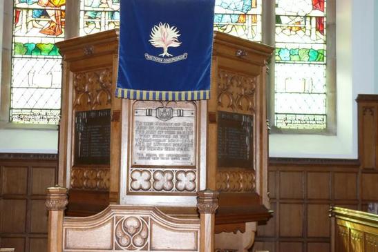 Dedication Plaque- TO THE GLORY OF GOD/AND IN GRATITUDE TO/THE MEN OF THIS PARISH/WHO SERVED IN THE/WORLD-WAR 1939-1945/AND IN LOVING MEMORY/OF THOSE WHO FELL/ Names Plaque 1-1939/[names] Names plaque 2-1945/[names]