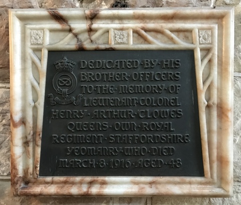Dedicated by his brother Officers to the memory of Lieutenant Colonel Henry Arthur Clowes, Queens Own Royal Regiment Staffordshire Yeomanry who died March 8 1916 aged 48