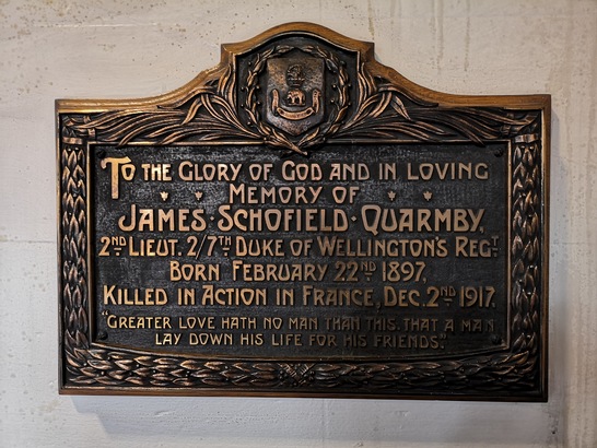 To the glory of God and in living memory of James Schofield Quarmby 2nd lieut 2/7th Duke of Wellingtons Regt born February 22nd 1897 killed in action in France Dec 2nd 1917. "Great love hath no man than this. That a man lay down his life for his friends".
