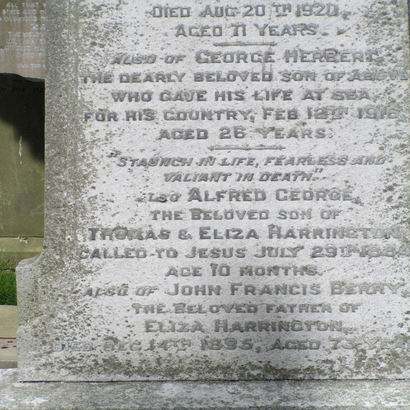 In Ever Loving Memory Of/ Thomas/ The Dearly Beloved Husband Of/ Eliza Harrington/ Who Departed This Life/ March 19th 1918,/ Aged 76 Years./ At Rest/ Also Eliza/ Beloved Wife Of The Above/ Died Aug 20th 1920,/ Aged 71 Years./ Also Of George Herbert/ The Dearly Beloved Son Of The Above/ Who Gave His Life At Sea/ For His Country, Feb 12th 1916/ Aged 26 Years./ “Staunch In Life, Fearless And/ Valiant In Death”/ Also Alfred George/ The Beloved Son Of Thomas & Eliza Harrington/ Called To Jesus July 29th (…)/ Aged 10 Months./ Also Of John Francis Berry/ The Beloved Father Of/ Eliza Harrington/ Died Dec 14th 1895, Aged 73 Years