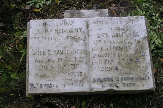 In Loving Memory Of L. Cprl Herbert, The Beloved Husband Of Annie E Humberstone Killed In Action July 1st 1916, Aged 34 Years. A Devoted Husband Also Pte Arthur, The Beloved Son Of W & E Humberstone Wounded In Action Died Feb 22nd 1919, Aged 43 Years. A Memento From Their Loving Father