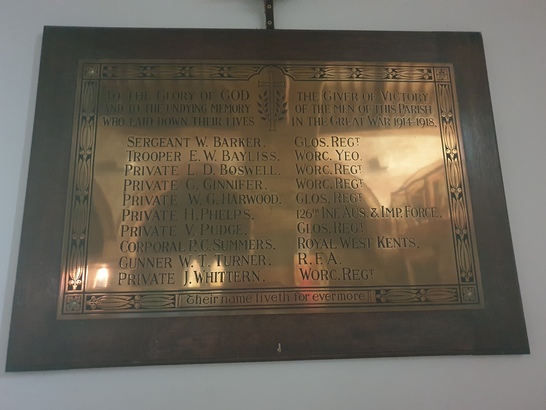 SERGEANT W.BARKER. GLOS. REGT.; TROOPER E.W.BAYLISS. WORC. YEO.; PRIVATE L.D.BOSWELL. WORC. REGT.; PRIVATE G.GINNIFER. WORC. REGT.; PRIVATE W.G.HARWOOD. GLOS. REGT.; PRIVATE H.PHELPS. 126TH.INF.AUS. & IMP. FORCE.; PRIVATE V.PUDGE. GLOS. REGT.; CORPORAL P.C.SUMMERS. ROYAL WEST KENTS.; GUNNER W.T.TURNER. R.F.A.; PRIVATE J.WHITTERN. WORC. REGT.