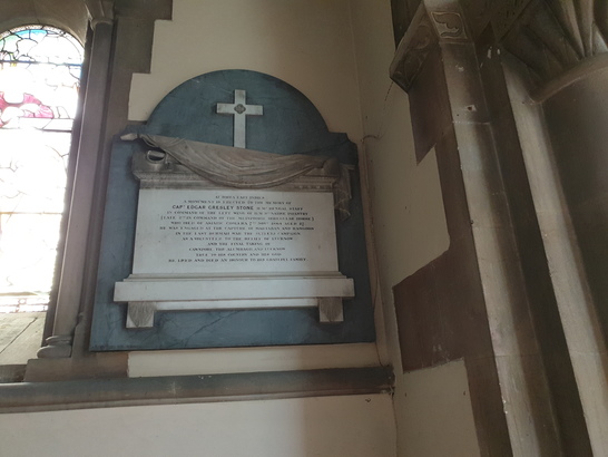 AT DACCA EAST INDIES A MONUMENT IS ERECTED TO THE MEMORY OF CAPT. EDGAR GRESLEY STONE H.M.s BENGAL STAFF IN COMMAND OF THE LEFT WING OF H.M. 5TH. NATIVE INFANTRY (LATE 2ND. IN COMMAND OF THE MEINPOORIE IRREGULAR HORSE) WHO DIED OF ASIATIC CHOLERA 7TH. NOVB. 1864 AGED 27. HE WAS ENGAGED AT THE CAPTURE OF MARTABAN AND RANGOON IN THE LAST BURMAH WAR THE SUTLETJ CAMPAIGN. AS A VOLUNTEER TO THE RELIEF OF LUCKNOW. AND THE FINAL TAKING OF CAWNPORE. THE ALUMBAGH, AND LUCKNOW TRUE TO HIS COUNTRY AND HIS GOD HE LIVED AND DIED AN HONOUR TO HIS GRATEFUL FAMILY.