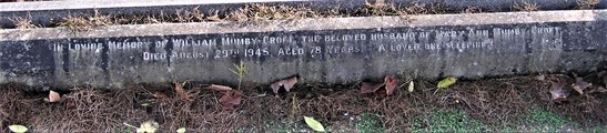 Kerb: In Loving Memory Of William Mumby-Croft, The Beloved Husband Of Mary Ann Mumby-Croft./ Died August 29th 1945, Aged 78 Years. “A Loved One Sleeping.” Kerb: In Ever Loving Memory Of Katherine, The Dearly Loved Daughter Of William And Mary Ann Mumby-Croft./ Died April 6th 1923, Aged 10 Years. “Safe In The Arms Of Jesus.” Kerb: Also Albert, The Dearly Loved Son Of William And Mary Ann Mumby-Croft, Who Was Killed In Action In France/ On May 21st 1916, Aged 24 Years. “Nobly He Did His Duty, But The Sacrifice Was Great.”