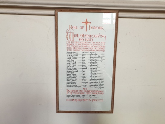 ROLL OF HONOUR WITH THANKSGIVING TO GOD FOR THE SAFE RETURN OF THE MEN AND WOMEN OF THE PARISH OF BUSHLEY IN THE COUNTY OF WORCESTER WHO SERVED IN HIS MAJESTY'S FORCES AND AUXILIARY UNITS DURING THE WORLD WAR 1939 -1945 (Names) AND IN PROUD AND GLORIOUS MEMORY OF THOSE WHO GAVE THEIR LIVES (Names) REQUIESANT IN PACE