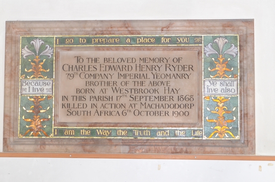 To the beloved memory of Charles Edward Henry Ryder, 79th Company Imperial Yeomanry, brother of the above, born at Westbrook Hay in this parish 17th September 1868, killed in action at Machadodorp South Africa 6 October 1900.