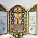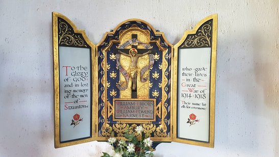 Centre panel: SO GOD LOVED THE WORLD / (Names) // Left door: TO THE / GLORY / OF GOD / and in lov/ing memory / of the men / of / Staunton // Right door: who gave / their lives / in the / Great / War of / 1914-1918 / 'Their name liv/eth for evermore.' //