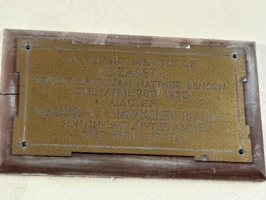 In Loving Memory Of/ Elizabeth/ Widow Of William Matthew Benson/ Died April 28th 1930/ Also Of/ Major W. L. Hawksley, R A.M.C./ Son-In-Law Of The Above/ Died April 3rd 1916