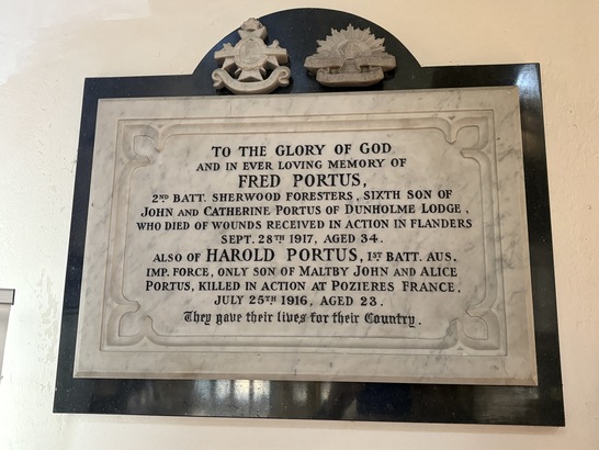 “To the Glory of God and in ever loving memory of Fred Portus, 2nd Batt. Sherwood Foresters, sixth son of John and Catherine Portus of Dunholme Lodge, who died of wounds received in action in Flanders Sept 28th 1917 aged 34. Also of Harold Portus, 1st Batt, Aus. Imp Forces, only son of Maltby John and Alice Portus, Killed in action at Poziers, France July 25 1916 aged 23. They gave their lives for their country.