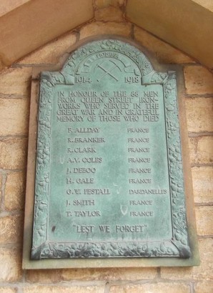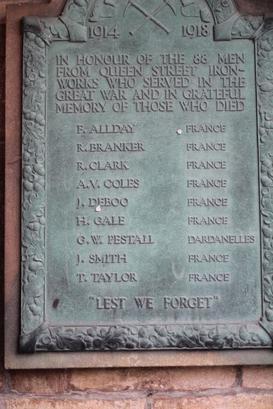 1914 1918 / IN HONOUR OF THE 88 MEN / FROM QUEEN STREET IRON- / WORKS WHO SERVED IN THE / GREAT WAR AND IN GRATEFUL / MEMORY OF THOSE WHO DIED / (Names) / "LEST WE FORGET"
