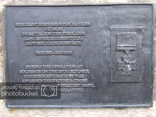 Top Plaque-JEDBURGH'S WAR HEROES His Plaque-SERGEANT JOHN BRUNTON DAYKINS/V.C..M.M./2.4 BATTALION THE YORK AND/LANCASTER REGIMENT (T.S.)/HOWDEN FARM, JEDBURGH/26.3.1883-24.1.1933/DURING THE OPERATION AT/SELESMIES ON THE 20TH OCTOBER/1918 SERGEANT DAYKINS WAS/AWARDED THE VICTORIA CROSS/…. GREATEST DASH,/INITIATIVE AND GALLANTRY