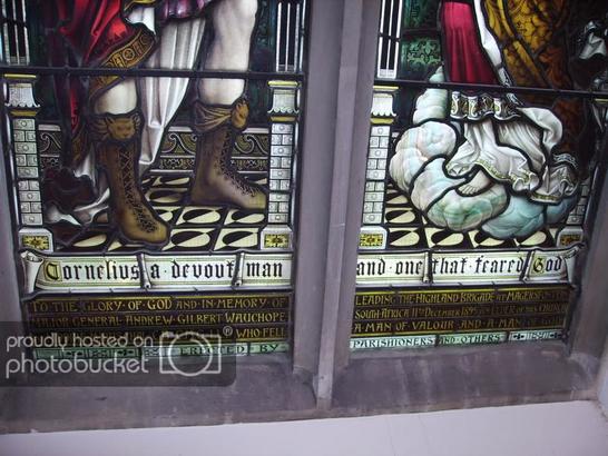 Left hand Light-Cornelius a devout man/TO THE GLORY OF GOD AND IN MEMORY OF/MAJOR GENERAL ANDREW GILBERT WAUCHOPE/OF NIDDRIE-MARSCHAL CB CMG LLD WHO FELL/ERECTED BY Right Hand Light-and one that feared God/LEADING THE HIGHLAND BRIGADE AT MAGERSFONTEIN/SOUTH AFRICA 11TH DECEMBER 1899 AN ELDER OF THIS CHURCH/A MAN OF VALOUR AND A MAN OF GOD/PARISHIONERS AND OTHERS