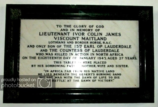 TO THE GLORY OF GOD/AND IN MEMORY OF/LIEUTENANT IVOR COLIN JAMES/VISCOUNT MAITLAND/LOTHIANS AND BORDER HORSE R.A.C./AND ONLY SON OF THE 15TH EARL OF LAUDERDALE/AND THE COUNTESS OF LAUDERDALE/WHO WAS KILLED IN ACTION IN NORTH AFRICA/ON THE EIGHTEENTH DAY OF JANUARY 1943, AGED 27 YEARS/THIS TABLET IS HERE PLACED/BY HIS SORROWING FATHER, MOTHER, WIFE AND SISTER/"IN AFRICA FAR FROM HIS NATIVE LAND/HE LIES BENEATH THE DESERT'S BURNING SAND/HIS LOT WAS WITH THE DAWN OF LIFE TO DIE/IN BATTLE AT THE DAWN OF VICTORY".