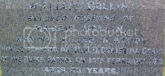In Memoriam / IN LOVING MEMORY OF / WILLIAM COLLIN / BELOVED HUSBAND OF / MAGGIE COLLIN / WHO WAS KILLED IN ACTION / WHILE SERVING ON HMD CHRISTINA CRAIG / OF THE DOVER PATROL ON 15TH FEBRUARY 1918 / AGED 38 YEARS / ALSO OF THEIR CHILDREN / MARY AND ROBERT DIED IN INFANCY / ALSO THE ABOVE MAGGIE COLLIN / WHO DIED 3RD NOV 1953 AGED 66 YEARS / I BORE THE CROSS I KNOW ITS WEIGHT / I DRANK THE CUP I HOLD FOR THEE / CANST THOU NOT FOLLOW WHERE I LEAD / I'LL GIVE THEE STRENGTH LEAN HARD ON ME