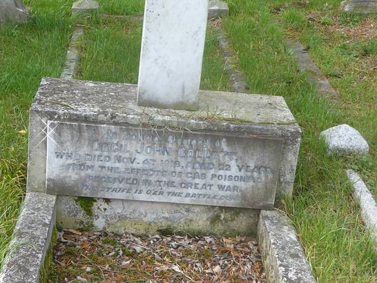 In loving memory of Cecil John Collett/who died Nov 4th 1918 aged 22 years/from the effects of gas poisoning/received in the Great War The strife is o’er the battle done
