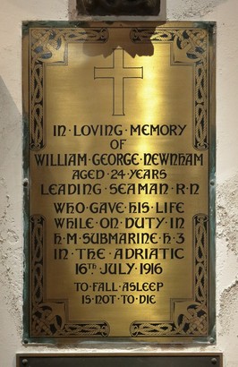 IN LOVING MEMORY OF WILLIAM GEORGE NEWNHAM AGED 24 YEARS/ LEADING SEAMAN RN WHO GAVE HIS LIFE WHILE ON DUTY IN/ HM SUBMARINE H3 IN THE ADRIATRIC 16TH JULY 1916/ TO FALL ASLEEP IS NOT TO DIED