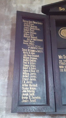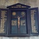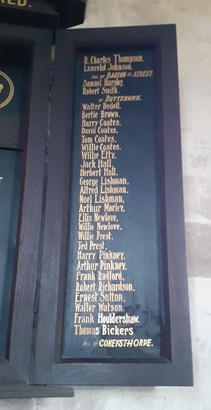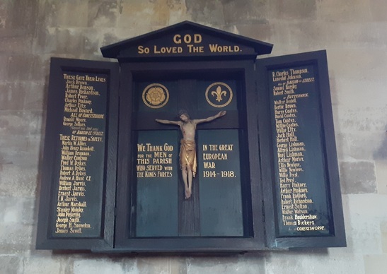 Centre panel: GOD / SO LOVED THE WORLD. / WE THANK GOD / FOR THE MEN OF / THIS PARISH / WHO SERVED WITH / THE KING'S FORCES / IN THE GREAT / EUROPEAN / WAR / 1914 - 1918. Left panel: THESE GAVE THEIR LIVES / [names x 7] / ALL OF CONEYSTHORPE. / [names x 2] / OF BARTON-LE-STREET. / THESE RETURNED IN SAFETY. / [names x 18] / Right panel: [names x 2] / ALL OF BARTON-LE-STREET / [names x 2] / OF BUTTERWICK / [names x 25] / ALL OF CONEYSTHORPE.