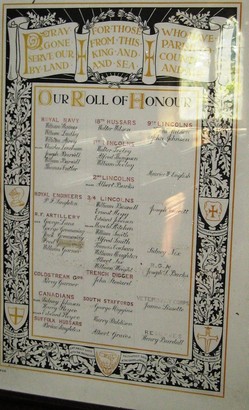ROYAL NAVY William Staines William Ludby William Airey KILLED Charles Lineham Joseph Burwell William Burwell Thomas Cutler ROYAL ENGINEERS P.F.Singleton R. F. ARTILLERY DIED George Lane George Greenaway Jack Greenaway Fred Greenaway William Garner COLDSTREAM GDS Percy Garner CANADIANS KILLED Sidney Johnson Harry Royce KILLED Edward Royce SUFFOLK HUSSARS Brian Singleton 18TH HUSSARS Walter Wilson 1ST LINCOLNS Walter Tooley Alfred Thompson William Tooley 2ND LINCOLNS KILLED Albert Burks 3/4 LINCOLNS William Bosnell Ernest Hogg Edward Johnson KILLED Harold Kitchen William Smith Alfred Smith Francis Cowham William Houghton Albert Nix William Wright TRENCH DIGGER John Steward SOUTH STAFFORDS George Higgins Harry Paddison Albert Graves 9TH LINCOLNS Frank Wilson John Johnson Maurice W. English Joseph Carrott Sidney Nix R. G. A. Joseph S. Burks VETERINARY CORPS James Lissett RESERVES Henry Burdall