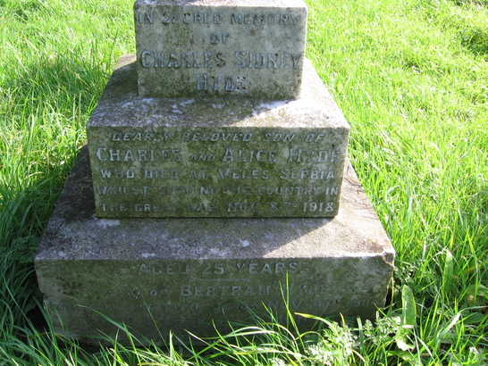 In Sacred Memory/ Of/ Charles Sidney Hyde/ Dearly Beloved Son Of/ Charles And Alice Hyde/ Who Died At Veles, Serbia/ Whilst Serving His Country In/ The Great War Nov. 8th 1918/ Aged 25 Years./ Also Of Bertram Hyde/ Who Fell Asleep In Jesus Nov. 4th 1904/ Aged (…)/ (line unknown)/ (line unknown