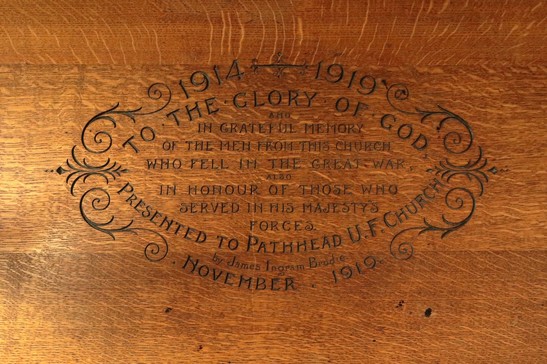 1914 - 1919/ TO THE GLORY OF GOD/ AND IN GRATEFUL MEMORY/ OF THE MEN FROM THIS CHURCH/ WHO FELL IN THE GREAT WAR/ AND/ IN HONOUR OF THOSE WHO/ SERVED IN HIS MAJESTY'S/ FORCE/ PRESENTED TO PATHHEAD U.F. CHURCH/ By James Ingram Brodie/ NOVEMBER 1919.