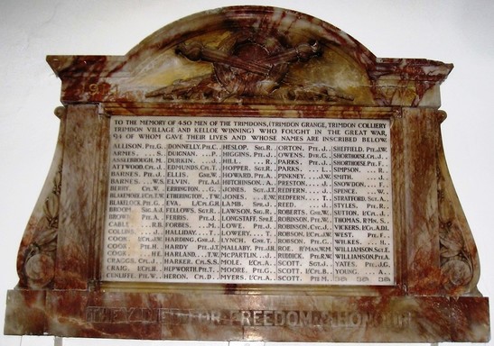Tablet- TO THE MEMORY OF 450 MEN OF THE TRIMDONS, (TRIMDON GRANGE, TRIMDON COLLIERY,/TRIMDON VILLAGE AND KELLOE WINNING) WHO FOUGHT IN THE GREAT WAR,/94 OF WHOM GAVE THEIR LIVES AND WHOSE NAMES ARE INSCRIBED BELOW/[names in 5 columns] Bottom of frame- THEY DIED FOR FREEDOM AND HONOUR
