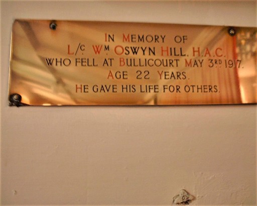 IN MEMORY OF/ L/C WM OSWYN HILL, H.A.C./ WHO FELL AT BULLICOURT MAY 3RD 1917./ AGE 22 YEARS./ HE GAVE HIS LIFE FOR OTHERS.