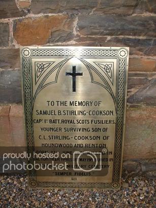 +/TO THE MEMORY OF/SAMUEL B STIRLING-COOKSON/CAPT 1ST BATT ROYAL SCOTS FUSILIERS/YOUNGER SURVIVING SON OF CL STIRLING-COOKSON OF/HOUNDWOOD AND RENTON/BORN 27TH JUNE 1891 KILLED IN/ACTION NEAR YPRES 18TH MAY 1915 BURIED IN/DICKEBUSCH MILITARY CEMETERY/"SEMPER FIDELIS"