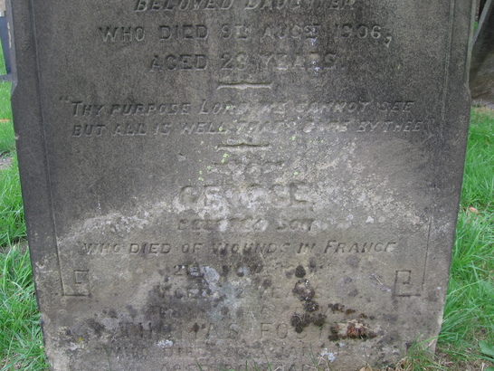 In/ Memory of/ Susan/ Beloved Wife Of/ Thomas Foster,/ Glentworth/ Who Died 23rd Decr 1915,/ Aged 53 Years./ Also Of Fanny,/ Beloved Daughter/ Who Died 9th Augst 1906,/ Aged 23 Years./ “Thy Purpose Lord We Can Not See/ But All Is Well That’s Done By Thee”/ Also George/ Beloved Son/ Who Died Of Wounds In France/ 21st Novr 1917/ Aged 32 Years./ Also Of Thomas Foster/ Who Died 27th January Aged 80 Years