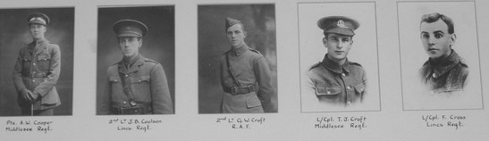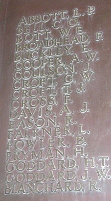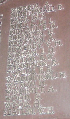 Surname & Initials Full Name Nationality Rank Regiment Unit Text Service No. Age at Death On Plaque On Photograph Boards ABBOTT, L. P. Lionel Pilkington UK Lieutenant Leicestershire 7th Battalion 28 Yes Yes BELL, C. O. Charles Ockley UK 2nd Lieutenant Bedfordshire Yes Yes BLANCHARD, R. Robert Australian Lieutenant Australian Infantry AIF 22nd Battalion 29 Yes Yes BOTT, W. E. William Ernest UK Captain Royal Fusiliers "D" Company 9th Battalion 25 Yes Yes BROADHEAD, F. UK Flight Cadet RAF 42nd Training Squadron Yes Yes BUCKLEY, E. Edward UK Captain York's and Lancs 2nd Battalion 30 Yes Yes COOPER, A. W. Arthur William UK Private Middlesex 1st/8th Battalion G/23979 21 Yes Yes COULSON, J. UK 2nd Lieutenant Lincolnshire 5th Battalion 22 Yes Yes CROFT, G. W. UK Lieutenant RFC 48th Squadron 22 Yes Yes CROFT, T. J. James Thomas UK L. Corporal Middlesex "C" Coy. 1st/7th Battalion 21 Yes Yes CROSS, F. UK L. Corporal Lincolnshire 1st Battalion Yes Yes DAVIS, A. J. Albert James UK Private Lincolnshire 1st/5th Battalion 240996 22 Yes Yes EASON, R. Raymond Praed UK Lieutenant Lincolnshire "A" Coy. 10th Battalion 21 Yes Yes FALKNER, L. Leonard UK Lieutenant Lincolnshire 8th Battalion Yes Yes FOWLER, B. Bateman UK Bombadier Royal Field Artillery "B" Battery, 295th Brigade 801048 21 Yes Yes FRYMAN, H. UK Private Royal Scots 1st/9th Battalion 351960 19 Yes Yes GODDARD, H. T. UK E.R. Act R. N. Yes Yes GODDARD, J. W. UK Private Royal Sussex 12th Battalion G/15418 Yes Yes GREENAWAY, C. Frederick Charles UK L. Corporal Lincolnshire 10th Battalion 64 21 Yes Yes HAGUE, P. Phil UK Driver Army Service Corps M/286420 Yes Yes HODGSON, R. N. UK Private South Staffs Yes Yes LEESON, P. Arthur Percy UK Private Lincolnshire 10th Battalion 66 28 Yes Yes Mc CARTHY, C. D. UK Sergeant E. Yorks 13th Battalion 13/518 22 Yes Yes MORRIS, A. Andrew UK 2nd Lieutenant Manchester 4th Battalion attached 12th Duke of Lancaster's Own Yeomanry 34 Yes Yes NIGHTINGALE, E. UK Acting Bombadier Royal Field Artillery "B" Battery, 291st Brigade 801053 29 Yes Yes PAGE, M. S. Meaburn Staniland UK 2nd Lieutenant Lincolnshire 4th Battalion 20 Yes Yes REED, C. De L. Leonard St. Clair UK Lieutenant Essex Yes Yes RIGGALL, E. C. Edward Gordon UK Flight Lieutenant Royal Naval Air Service Yes Yes ROBINSON, G. George Henry UK Private Middlesex/1st King Edward's Horse(formerly SR/656) 16th Battalion SR/1619 23 Yes Yes ROWSTON, A. Arthur Winter UK Private Lincolnshire 1st/5th Battalion 242513 Yes Yes SEATON W. H. William Haig New Zealand Corporal Auckland (NZEF) 1st Battalion 12/4085 27 Yes Yes SOWERBY, V. H. Victor Holgate UK 2nd Lieutenant Lincolnshire 2nd Battalion Yes Yes STREAM, J. H. John Harvey UK Lieutenant Royal Flying Corps & 7th Battalion Lincolnshire 20th Yes Yes TAYLOR, B. W. UK Private Lincolnshire Yes Yes THOMPSON, A. R. UK Lieutenant RAF 6th Squadron No Yes THOMPSON, R. Ralph Motson UK Private Lincolnshire 10th Battalion Yes Yes TOPLISS, E. E. Ernest Edward UK Gunner Tank Corps 9th Battalion 78040 24 Yes Yes WADDINGTON, J. H. James Hubert UK 2nd Lieutenant Welsh 16th Battalion 20 Yes Yes WATSON, H. Harry UK Private Lincolnshire 1st Battalion 1769 Yes Yes WINDEATT, A. Alexander UK Gunner Royal Field Artillery "A" Battery 296th Brigade 240978 23 Yes Yes WOOD, G. UK Cadet Merchant Navy Yes Yes WOOD, H. UK Cadet Merchant Navy Yes Yes