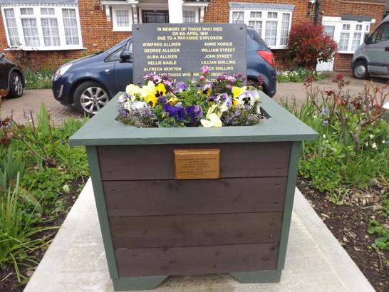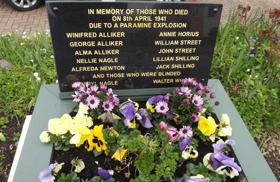 Tablet: IN MEMORY OF THOSE WHO DIED / ON 8TH APRIL 1941 / DUE TO A PARAMINE EXPLOSION/ (Names) / AND THOSE WHO WERE BLINDED / (Names) Plaque: THIS MEMORIAL WAS DEDICATED ON / 9TH APRIL 2016 / BY REV K.R. JEFFREIS / RESEARCHA ND PLANNING BY / J.F. READ / FORMER RESIDENT OF BURGESS AVENUE/ 8TH APRIL 1941
