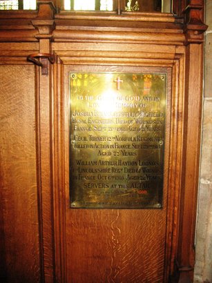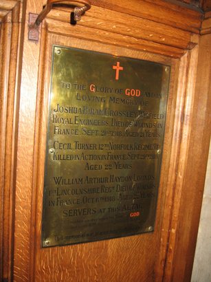 To the glory of God and in loving memory of Joshua Biram Crossley Wigfield Royal Engineers died of wounds in France September 21st 1918 aged 21 years. Cecil Turner 12th Norfolk Regiment killed in action in France 29th September 1918 aged 22 years. William Arthur Haydon Lounds 1st Lincolnshire Regiment died of wounds in France 6th October 1918 aged 22 years. Servers at this altar therefore are they before the throne of God and serve him day and night in his temple. This memorial was placed here by their parents.